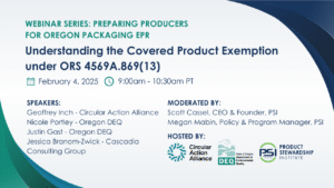 Hosted by the Product Stewardship Institute on behalf of the Oregon Department of Environmental Quality (DEQ) and in partnership with Circular Action Alliance (CAA), this is the final webinar in a webinar series informing producers about their obligations under Oregon’s Plastic Pollution and Recycling Modernization Act – the state’s new extended producer responsibility (EPR) law for packaging, paper, and food serviceware – which begins July 1, 2025.