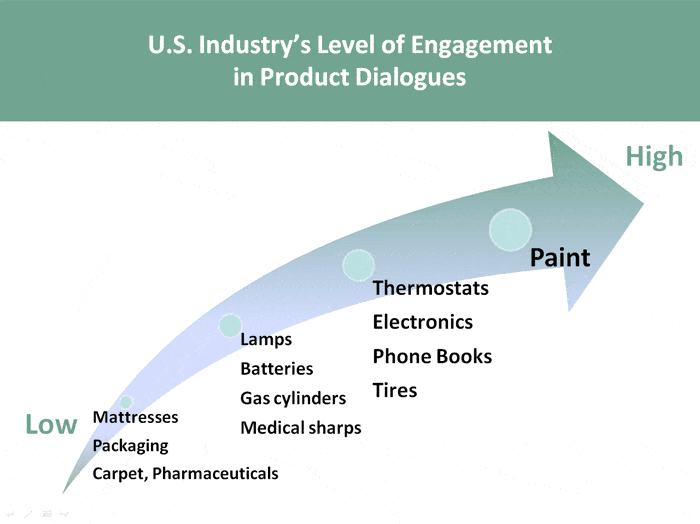 Of the industries we work with, only two manufacturers – paint and rechargeable batteries – have fully engaged government, and both were responding to the threat of legislation. Perhaps the paint industry learned from previous legislative battles on lead paint and volatile organic compounds and saw how it could benefit from the unified national process that PSI offered. Maybe the rechargeable battery industry learned that collaboration with governments was needed to implement its own voluntary producer responsibility program. Whatever the case, the rest of the industries have either refused to engage in a constructive dialogue about the problems caused by their products or they engaged for a period of time, sometimes up to six years, before digging in against further discussion.