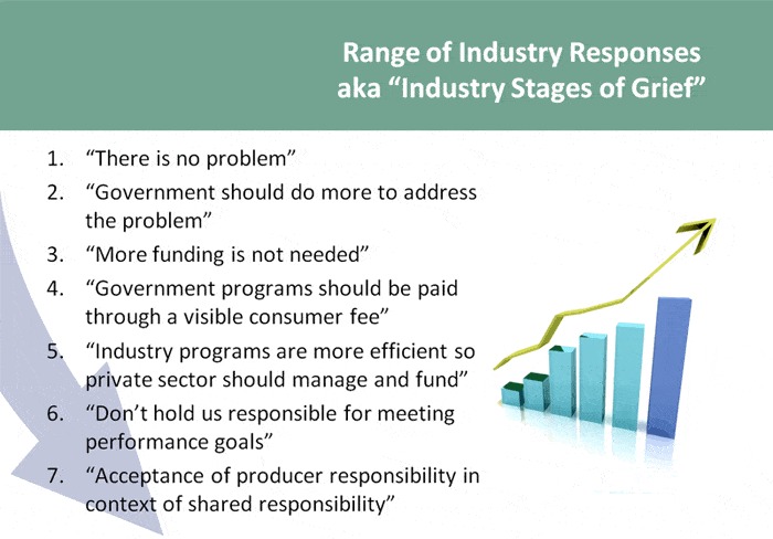 Over the past decade, PSI has knocked on the proverbial door of over 15 industry sectors and offered to work collaboratively to reduce the unintended lifecycle impacts resulting from their products. Companies, like the people who run them, have responded in a variety of ways. These responses usually fit within a trajectory of perspectives that reflects the culture of the industry sector and the individuals who lead them. Whether and how these perspectives change through discourse is also a reflection of the industry, its leadership, and external influence and circumstances. In general, PSI’s experience is that the perspective of most industry sectors proceeds along the following path during the course of a dialogue: (1) there is no problem; (2) government should do more to address the problem; (3) more funding is not needed; (4) government programs should be paid for through a visible consumer fee; (5) industry programs are more efficient so the private sector should take programmatic control; (6) don’t hold us responsible for meeting performance goals.