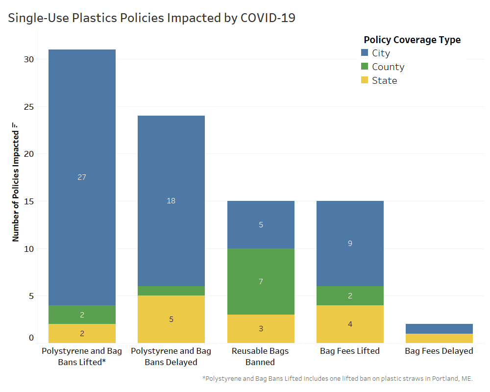 As of today (April 1, 2021), 25 of the 88 policies, or 28 percent, remain affected, all of which are bans or fees on plastic bags that continue to be either delayed in implementation or are still suspended. In addition, eight jurisdictions withdrew previously planned bag or polystyrene ban legislation, most notably Colorado, Maryland, and New Hampshire, all of which pulled bag bans. In part due to the now-debunked myth that reusable bags transmit COVID-19, Ohio and Pennsylvania passed statewide preemption laws that prevent municipalities from banning plastic bags through the middle of 2021. The state of Pennsylvania is currently being sued by a group of municipalities, led by Philadelphia, who want to maintain their ability to ban bags at the local level. The graphs below illustrate how these policies were spread across cities, counties, and states and how many of them continue to be impacted one year after the start of the pandemic.