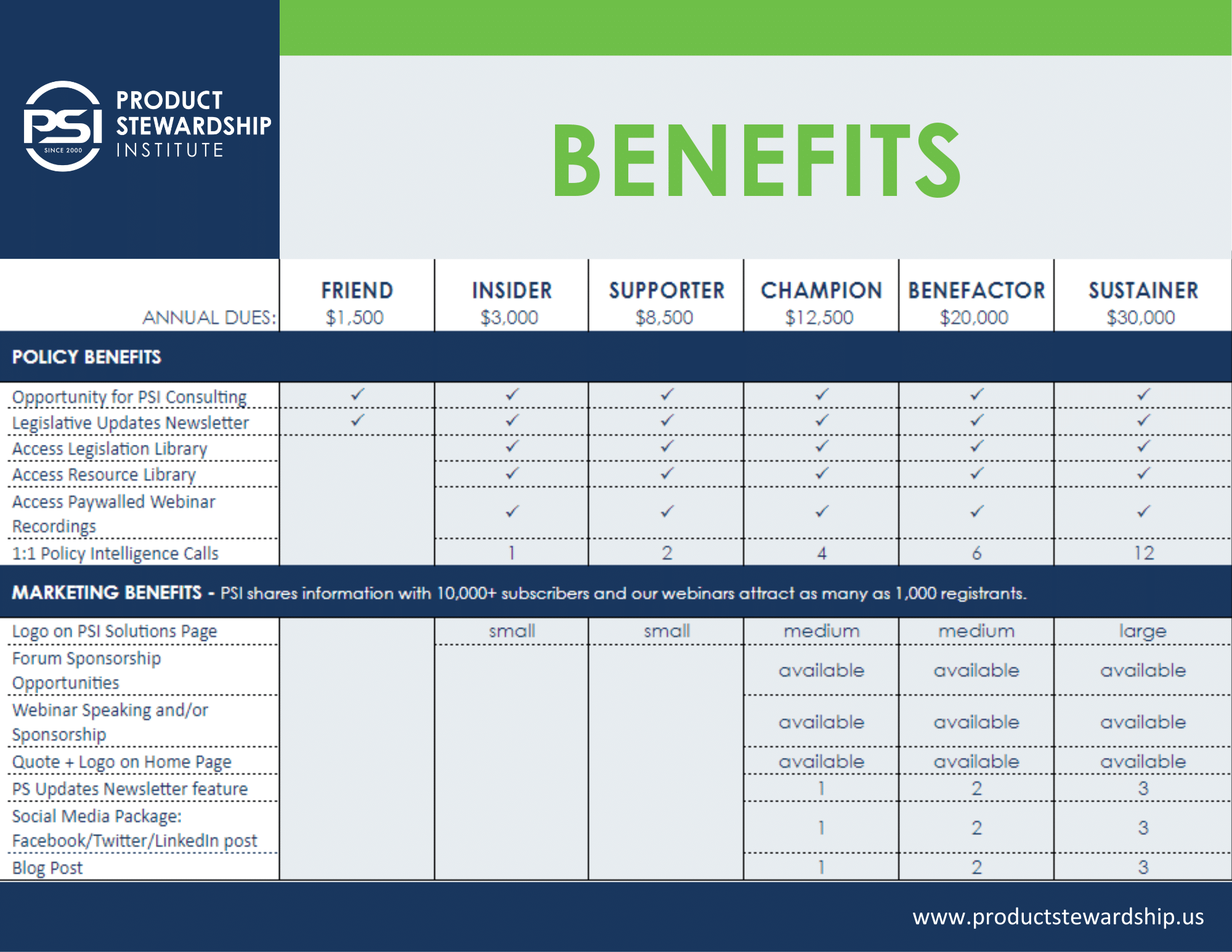 Join online today. Depending on engagement level, PSI Partners gain access to benefits that cover PSI’s 20+ years of EPR policy experience across the entire municipal waste stream, including: