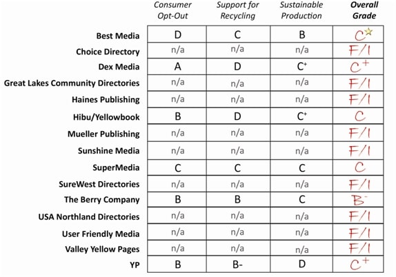 Nine publishers received grades of “Fail/Incomplete,” as they ignored PSI’s repeated requests for data and because public information about their practices was unavailable. These include Choice Directory, Great Lakes Community Directories, Haines Publishing, Mueller Publishing, Sunshine Media, SureWest Directories, USA Northland Directories, User Friendly Media, and Valley Yellow Pages.